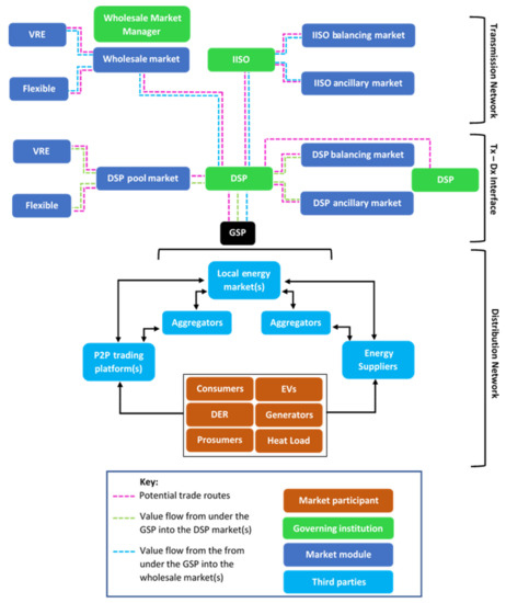 Schematic of the proposed electricity market design with potential trade routes, value from the GSP into the DSP and wholesale market identified. Only one GSP for illustrative clarity. In reality, there would be multiple GSPs within a DSP’s geographical remit. Entities listed within a GSP are not an exhaustive list, but a representation of several likely parties to be operational within this geographical area. Tx and Dx refer to transmission network and distribution network, respectively. Market participants refer to generating or demand-side asset(s), such as prosumers, EVs and those with flexible electrified heat load. Authors’ own.
