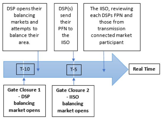 This is realised through a pay-as-clear pool market, a balancing and ancillary market at each of the GSPs which is governed by the evolution of the current distribution network operator (DNO), known as the distributed service provider (DSP) [22]. These ‘local’ markets bring forward regional differences to indicate to investors where on the network a specific technology and services would be valued. These are not to be confused with local energy markets (LEMs) which are private platforms operated by third parties such as Centrica [33]. The national wholesale market is also reconfigured to increase investment certainty to both variable and flexible technologies located on both the distribution and transmission network through amendments to regulation and trading arrangements. The electricity market design operates over a broad timescale, from years in advance up to the delivery of the traded electron. The timescale of focus for this proposed design is that of the SPOT, i.e., 48 h up to, and including, the delivery of the contracted service. This paper also proposes reconfigurations to the balancing and ancillary markets within this timescale. The rationale for focusing on this timeframe is underpinned by the importance of operating closer to real time for variable renewable energy (VRE) generating assets, as this permits more accurate forecasting and allows one to re-position themselves to mitigate imbalance charges [40,41]. The importance of the Day Ahead (DAH) and Intraday (ID) market will continue as trading closer to delivery will become increasingly critical [41].
