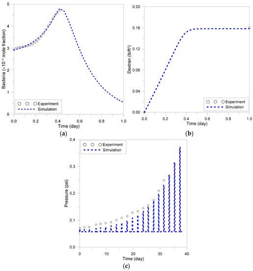 The reaction rates of the four types of microbial metabolism are calculated using Equations (6) and (7), and the history matching for the experiment was performed with matching parameters , , and . The values of the variables minimizing the matching error are shown in Table 1. Figure 1a,b describes the microbial growth and dextran production, respectively. The pressure difference measured in the pressure measurements shown in Table A2 is shown in Figure 1c, and the simulation results are matched with the experimental data. The matching parameter in this simulation was in Equation (21), and it was calculated to be 244.8. The history match errors measured in the batch model and sandpack model are 1.6% and 4.6%, respectively.