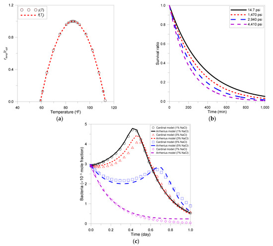 where is the reaction rate as a function of NaCl concentration, is NaCl concentration, is the optimum NaCl concentration for microbial growth, and is the upper limit of NaCl concentration for microbial growth. Since the optimal NaCl concentration of the model bacteria was close to zero [64,65,66], Equation (16) can be defined as follows: