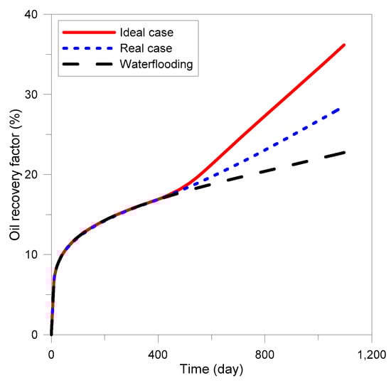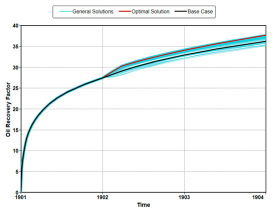The conditions of the reservoir used for the MEOR process are indicated in Table A3. The reservoir had a high probability of a conformance problem because of the high transmittance channels. Production was assumed to continue for three years. After implementing waterflooding during the first year, MEOR treatment was performed for eight weeks, and then waterflooding was implemented again. The model that did not reflect the environmental impact was named the “ideal case”, and the model accounting for the environmental impact was named the “real case”. Before the optimization, the injection rate in both cases was 50 bbl/day, and the sucrose concentration was 0.005 (mole fraction). In the real case, the temperature of the injected water and the NaCl concentration were set to 75 °F and 1%, respectively. These no-optimization models were used as a base case for each case. As shown in Figure 3, the model considering environmental factors tended to decrease the productivity of oil by 21% compared to the ideal case. Nevertheless, it could be seen that the oil recovery of MEOR in the real case was 25% higher than that of waterflooding.