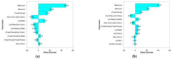 Figure 4 shows a tornado plot resulting from the sensitivity analysis of the design parameters. The values in figures called effect estimates are the expected change of the oil recovery when the scaled parameters travel from −1 to 1. In other words, the larger these values are, the greater the influence on oil recovery change. The sensitivity analysis showed that there were differences in the priority of parameters affecting oil recovery in both cases. In both cases, the quadratic effect of the treatment period had the greatest effect on recovery. However, the quadratic effect of injection temperature had the second largest effect on recovery in the real case. The maximum oil production predicted through this optimization is shown in Figure 5. The maximum oil recovery for the ideal case was 48.3%, which was a 33% increase over the no-optimized model. The recovery of the optimized real case was 41.8%, which was a 47% increase over the no-optimized model. These results showed that it was important to consider environmental effects for the accurate prediction and optimization of productivity. The actual proxy models used for optimization are the same as Equations (A1) and (A2).