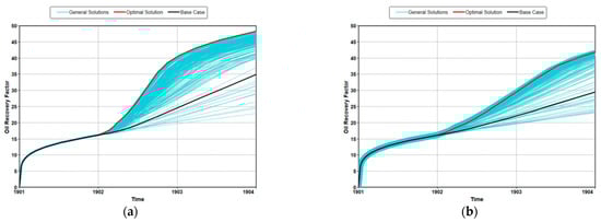 Optimization results for oil recovery: (a) ideal case and (b) real case.