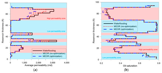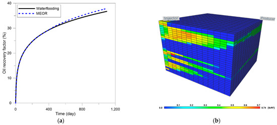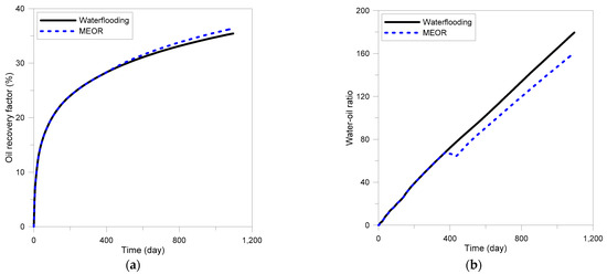 To evaluate the effectiveness of MEOR through the developed model, the process was applied to the highly-heterogeneous actual field model based on logging data from King Island [53]. The reservoir conditions are shown in Table 3. Since the reservoir depth was approximately 5000 ft, the reservoir pressure was assumed to be 2500 psi, which was calculated using a typical pressure gradient of 0.5 psi/ft. The reservoir pressure was also assumed to be 100 °F. Waterflooding and MEOR treatment were applied in the same way as the previous models, and the injection temperature and salinity were 80 °F and 1% NaCl, respectively. Figure 6 represents the influence of the MEOR process on the oil recovery and water-oil ratio (WOR). The recovery factor of MEOR was 36.4%, which was improved by 2.6% compared with waterflooding. WOR was also reduced by the MEOR, which was decreased by 11%. The distribution of dextran produced in the reservoir and the resulting permeability reduction in the highly permeable zone are shown in Figure 7. Most of the injected fluid flowed through the highly permeable layers, and it was found that most of the dextran was generated near the injection well. At this time, even if dextran was formed in the high permeability layers as shown in Figure 7a, the effect of reducing the permeability was not very large, as shown in Figure 7b.