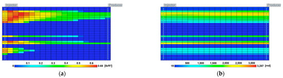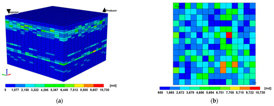 Particularly in layered systems, the results of 2D and 3D models will not show a significant difference. However, some differences may occur due to the curvilinear flowline in the 3D model. To confirm this, the extension of the 2D model to the 3D heterogeneous model was shown in Figure 8a. Though the average permeability of each layer was the same as in the previous 2D model, the permeability distributions in the horizontal direction were geostatistically generated to have a Dykstra–Parsons coefficient of 0.4 (Figure 8b). This coefficient can be calculated as follows [68]: