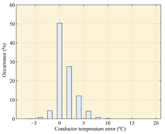 In the real case studied, errors in calculations using CIGRE TB601 are represented in Figure 2. It is observed that, in most cases, errors are mainly between −5 and 5 °C with a maximum of 20 °C. The Root Mean Squared Error (RMSE) of the calculation is 2.28 °C. These errors in temperature calculations have their origin in different issues, such as errors in procedures, in sensors, and by the use of spot measurement.