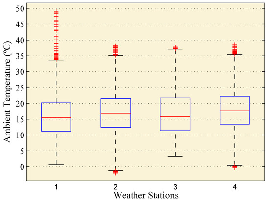 In Figure 3, a box-plot with ambient temperature data is shown for all . In this box-plot, median, 25th, and 75th percentiles, maximum, minimum, and outliers are plotted. It is observed that, in the case of , there are a lot of outliers, reaching values of ambient temperature close to 50 °C, obviously erroneous. This indicates that provides wrong data, so it will produce incorrect ampacity results due to errors in sensors. This wrong data is also observed in Figure 4. The consequences of this type of wrong data is that, with high ambient temperature, the ampacity can reach the lowest value of the line, and, consequently, it will assume this wrong value as ampacity of the whole line.