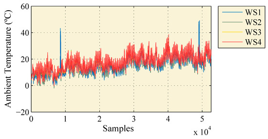 In Figure 8, it is clear that there are more differences between ambient temperatures of and the others. So, it can be said that obtains lower ambient temperature values than the others. Other stations apart from have a less pronounced variability.