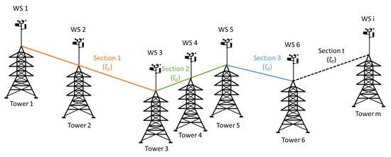 In Figure 5, a theoretical line is represented. This line has m electric towers, t sections, and i weather stations. Section parameter, set of consecutive spans with the same direction, is important for the climatological study since spans with same direction will have equal attack angle of wind.