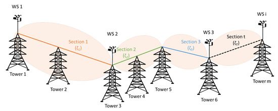 A system with less resolution would be the installation of one weather station per section (t = i). The solution adopted in the studied case is the installation of several weather stations according to a climatic study of the zone. In this case, it is necessary to define the area of influence of each weather station. These areas are defined in the climatic study. Due to this approach, several towers will be monitored with the same weather station depending on the influence area. An influence area can be large or can be affected by very different weather conditions, so it is possible that points within the same influence area have weather conditions quite different from those measured by the corresponding WS. Because of this, ampacity is obtained with Equation (9), and conductor temperature with Equation (8), for all m within influence area of .