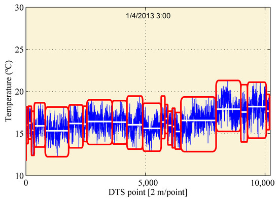 Conductor temperature differences can be observed in Figure 10. In this figure, conductor temperature along the line in one measurement interval n is represented. The white line represents the conductor temperature average for each section, red rectangle represents, in x axe, the start and the end of the section, and, in y axe, the maximum and the minimum value of all monitored points of the section. The blue line represents the conductor temperature measurements of the approximately 10,200 points of DTS system.