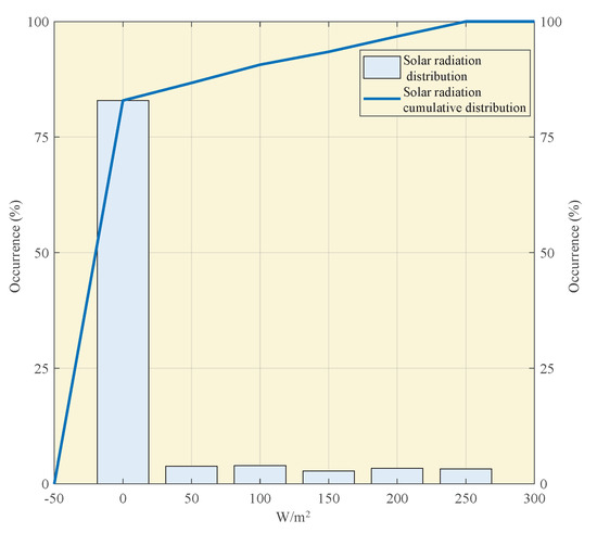 Distribution function and cumulative distribution function of solar radiation for 7 days.