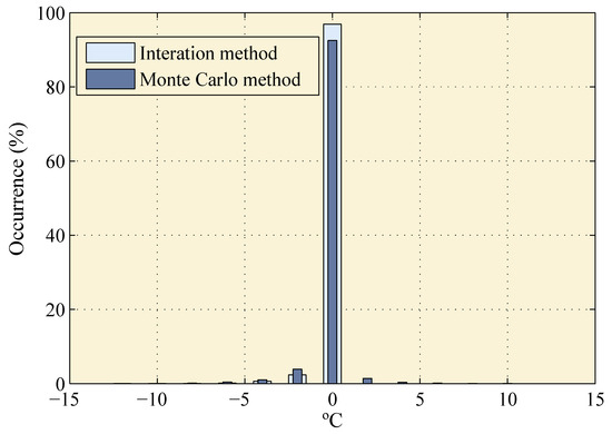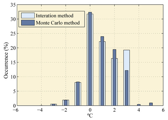 To study the viability of each procedure, iteration or Monte Carlo, histograms of the differences between effective and measured variables, together with Root Mean Square Difference (RMSD) and correlation coefficient, are determined. It is important to obtain effective meteorological values close to measured ones, so a better method will reduce the error in temperature calculation with small variances in the set of weather conditions.