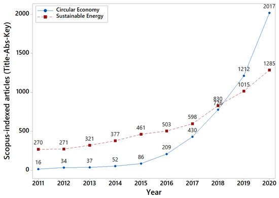 Scopus-indexed articles including “circular economy” or “sustainable energy” in T-A-K.