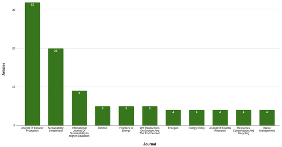 Figure 2 displays Scopus-indexed journals with four or more articles, including the combination of words (“circular economy” or “sustainable energy”) and “education”. Notice that the Journal of Cleaner Production, the Sustainability journal, and the International Journal of Sustainability in Higher Education seem to be the main references in this area, with several energy-related journals also included among the ones with more published documents on the aforementioned concepts.