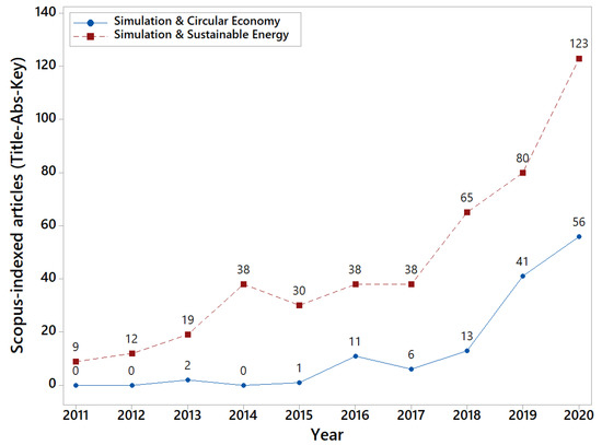 Scopus-indexed articles including “simulation” and (“circular economy” or “sustainable energy”) in T-A-K.