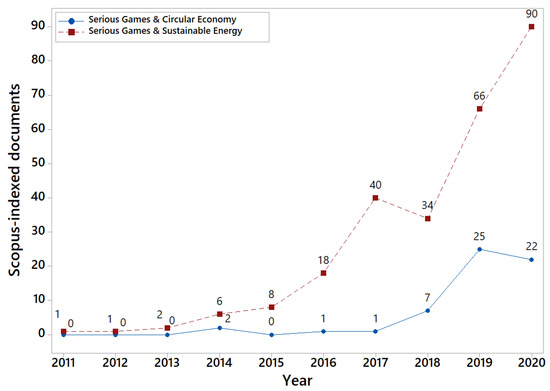 This section contextualizes the present work by providing an updated picture of the research landscape in the field of CE and sustainable energy, with a focus on the area of simulation and serious games with learning purposes. There is a clear growing trend in the number of scientific publications in both fields, as shown by Figure 1, which depicts the evolution of Scopus-indexed articles that include the terms “circular economy” or “sustainable energy” in their title, abstract, or keywords (T-A-K) sections.