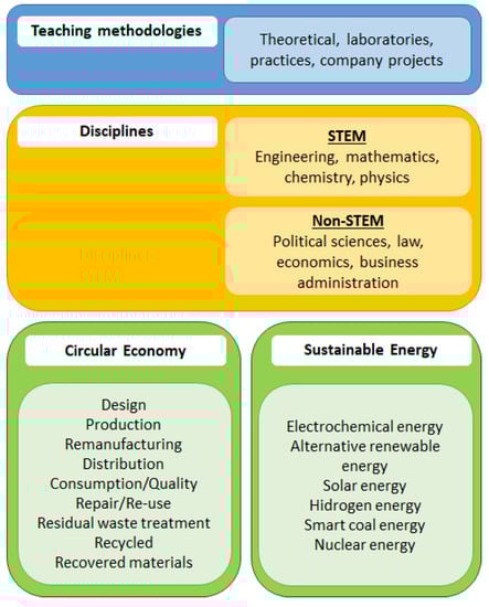 We have divided this review section into two parts. In the first one, we discuss recent work on the circular economy concept. In the second one, we provide an overview of recent articles related to sustainable energy principles. Of course, both concepts are strongly correlated, and we establish the corresponding connections between them during our analysis. As a result of this review, we have been able to generate Figure 5, which summarizes the teaching methodologies required, the disciplines that must be considered, and the main concepts that should be included in HE curricula oriented to promotion of sustainability issues.