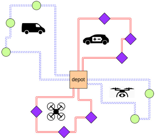 As a first example, Figure 6 displays a toy example where different types of vehicles—diesel and electric ones, including drones—are combined to perform last-mile delivery operations.