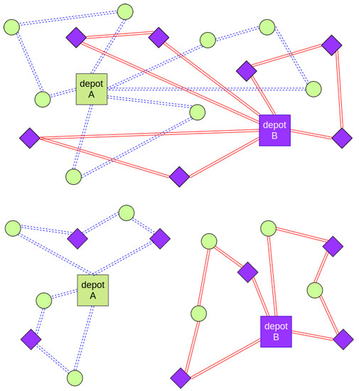 Another example of similar homework activities that promote a more environmentally friendly view of transportation operations are related to the use of horizontal cooperation strategies [81] and intelligent back-hauling [82]. In the former, and following strategies similar to those proposed in Quintero-Araujo et al. [83], students are able to quantify the potential savings in energy and emissions that can be achieved by establishing alliances among carriers. In the latter, Belloso et al. [84] are also able to quantify environmental benefits associated with the effective use of backhauls in long trips, so that trucks do not return empty to their bases. Students use datasets and biased-randomized algorithms, which makes use of simulation to introduce a special randomness into a heuristic procedure [85], to generate a set of alternative solutions to distribution problems [86]. Thus, for instance, Figure 7 shows a simple case in which two carriers, one with origin in depot A (circles) and another with origin in depot B (diamonds), decide to shift from a non-cooperative strategy (upper part of the figure) to a cooperative one (lower part of the figure), where each carrier might service customers of the other. Even in this toy example, one can observe the gains in the distribution plan: less routes (and vehicles) are required to do the job, the total distance traveled is reduced, and one should expect a significant reduction in gas emissions.