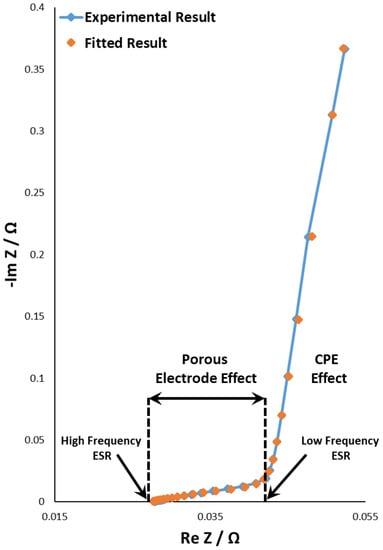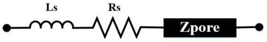 The equivalent impedance model of the super-capacitor is composed of an equivalent series inductance LS, a series resistance RS and a pore impedance ZPORE as shown in Figure 1. Here, ZPORE represents the non-ideal porous electrode by a ladder circuit in which an electrolyte resistance Re connected in parallel with a constant phase element (CPE) are connected in parallel as expressed by Equation (3) [18,19]. Figure 2 shows the Nyquist impedance representation of the equivalent circuit model of the supercapacitor.