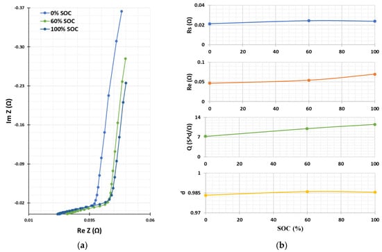 (a) Nyquist impedance plots of a supercapacitor (2.7 V 10 F) at 0%, 60% and 100% SOC (b) Parameters variation at each SOC.