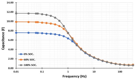 In the AC test, the magnitude of the capacitance varies depending on the frequency of the perturbation current and the time to affect the porous electrode [17]. This becomes constant below 0.1 HZ as shown in Figure 4.
