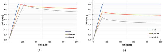 (a) Simulation of self-discharge with different “d” parameter up to Vrated = 2.7 V (Ic = 100 mA, C = 10 F, equivalent series resistance (ESR) = 0.065 mΩ) (b) Simulation results of self-discharge with different ‘d’ parameters (Ic = 100 mA, C = 10 F, ESR = 0.065 mΩ).