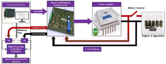The graphical user interface (GUI) is developed using NI-LabView 2018. An NI-PCI-6154 DAQ data acquisition board is used, and a signal conditioning and sensing circuit is placed in between the data acquisition DAQ board and the device under test (DUT). A combined multi-sine waveform with desired amplitudes and frequencies is generated by DAQ and used to control the power amplifier which perturbs the supercapacitor.