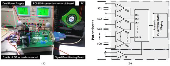 Then the current and voltage signals by the perturbation are sensed and converted into digital data. The PCI-6154 is a simultaneous sampling multifunction input/output I/O device for PCI bus computers from National Instruments. It is an isolated PCI device featuring four isolated differential 16-bit analog inputs (AI), four isolated 16-bit analog outputs (AO), six digital input (DI) lines, four digital output (DO) lines, and two general-purpose 32-bit counter/timers. All analog to digital converter (ADC) converters and digital to analog converter (DAC) converters are capable of sampling the data at 250 KS/s for each channel. The 16-bit ADC makes the board capable of sampling the voltage and current waveforms simultaneously with a very high resolution of 305 μV/Bit. Only the desired frequency component of the waveform is extracted using a lock-in amplifier (LIA). Figure 7a shows the developed hardware. It is capable of testing three supercapacitor cells at the same time in a single test which can be increased as many as the number of channels in a DAQ board. Figure 7b represents the topology used for acquiring multi-cell voltage and current information.