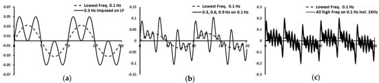Combined multi-sine method. (a) Lowest frequency 0.1 Hz and 0.3 Hz imposed on 0.1 Hz (b) 0.3 Hz, 0.6 Hz, 0.9 Hz super imposed on 0.1 Hz. (c) All the frequencies including high frequency components superimposed on 0.1 Hz.