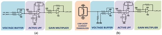 The resulting current in response to the applied voltage perturbation is sensed through current transducer LEM LA-25P, which is a closed-loop current transducer using the Hall effect with a conversion ratio of 1:1000 and an accuracy of ±0.95%. Figure 10b presents the current feedback signal conditioning circuit. It has four stages including a current transducer, a voltage follower, an active low pass filter and a gain multiplier.