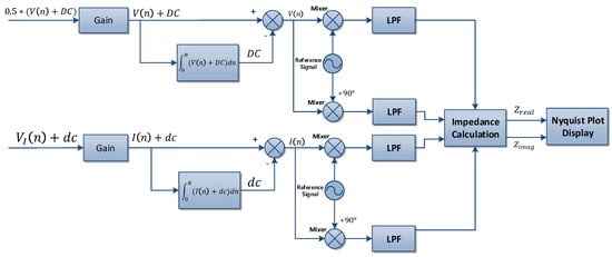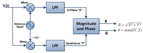 Thus, LIA allows higher accuracy for the measurement of small AC signals in the low-frequency range and acquires less computational time. LIA implemented in the proposed system extracts the Fourier components of the reference frequency from the acquired current and voltage measurements and the impedance at the reference frequency can be calculated from the results. The block diagram shown in Figure 13 has an input signal Vin measured from the system in response to the generated perturbation, two reference signals with 0 degree and 90-degree phase shift, respectively. The input signal is multiplied with the reference signal having a 0-degree phase shift and passed to low pass filter (LPF) to produce the X component or in-phase component. The same input signal is then multiplied to the 90-degree phase shifted reference and passed to the LPF to produce the Y component or quadrature-phase component. The principle of LIA is presented by Equations (10)–(12).