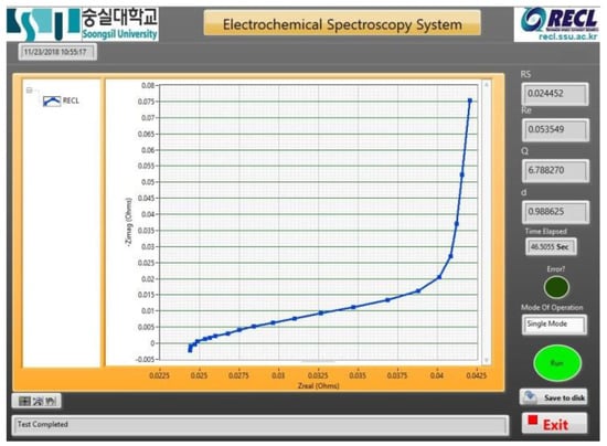 Since EIS requires measurement of impedance components at many frequencies, the time required for the test is calculated as the inverse sum of all the measured frequencies as Equation (1). To analyze the impedance spectrum of a supercapacitor through electrochemical impedance spectroscopy, it takes a long time because tests up to 0.01 Hz are required [17].