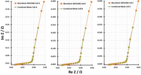 Comparison of EIS results by WEIS500 and the developed instrument for three supercapacitors A, B, C (C = 10 F, Vrated = 2.7 V).