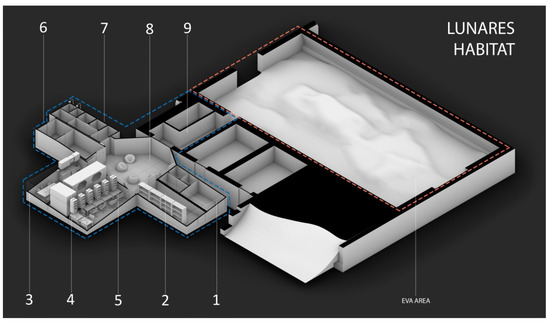 An axonometric projection of the LUNARES habitat three-dimensional model. Source: Leszek Orzechowski and Agata Mintus. Layout of LUNARES habitat is presented in Table 3.
