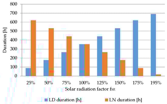 This study was performed for the following fSR values: 25%, 50%, 75%, 100%,125%, 150%, 175% and 195%. fSR values exceeding 100% were assumed only for the lunar polar location (89°) where these illumination conditions may actually be found. It was assumed that LD and LN durations are constant. As presented by [64,66] the validity of this assumption must be individually verified for a specified site.
