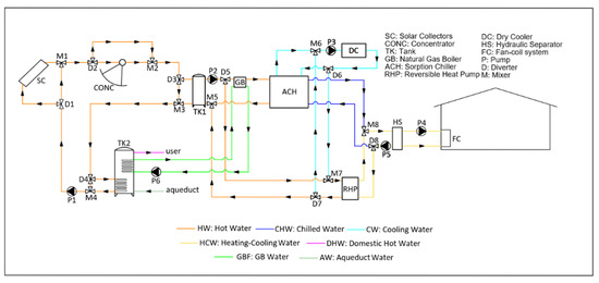 In winter, the dry cooler system is used as a heat source when the solar thermal energy is scarce, while in summer it is used to reject heat from the adsorption chiller and the heat pump operating as a chiller. An auxiliary heating boiler is used to match the DHW thermal demand in case of low solar radiation and when the produced heat by the solar devices and stored in the thermal storage is not sufficient to supply the adsorption chiller. Moreover, the reversible heat pump is also adopted in summer as an additional backup air conditioning device in case of low-temperature level in the thermal energy storage. The layout of the system has been shown in Figure 2.