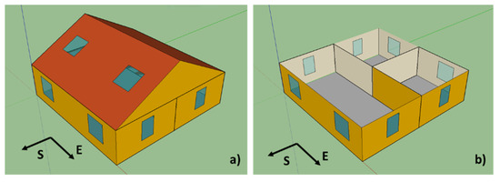The case study adopted to investigate the system energy and economic performance consisted of a one floor single family household, with an attic, and a sloped roof (Figure 3). The model of the building structure has been adopted in other papers of the authors [30]. In the present case, the thermal load of the building were calculated within the developed model assuming Typical Meteorological Year (TMY) climatic conditions with the adoption of Meteonorm weather data of Cracow, Southern Poland. The building geometrical structure has been reported in Figure 3. The ground floor area consisted of one room of 50 m2 and two rooms of 25 m2, while the attic had a useful area of 75 m2. The floor height was 2.70 m and the slope of the roof was 30°. The building exposition with respect to the south-north direction has been set as shown in Figure 3. The building envelope elements, as walls, roof, and floor, were modeled setting several layers for each component simulating the structure of a realistic building envelope. The information about building envelope components have been reported in Table 2 in terms of thermal transmittance and structure.