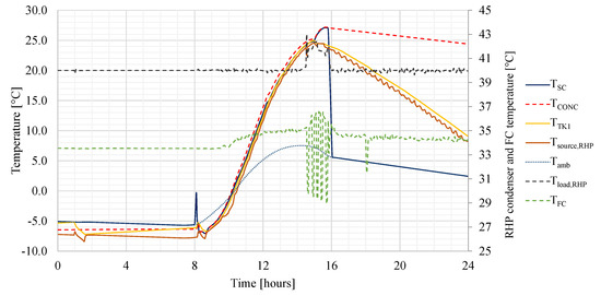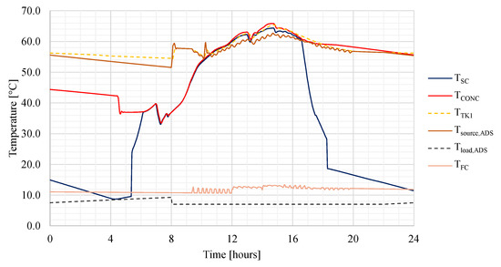 Furthermore, the temperature trends also show that the thermally driven chiller is sufficient to provide space cooling during the selected day, indeed the temperature of TK1 oscillates on the activation range of ADS and the chiller is capable to provide chilled water at the fixed set point (7 °C). In the same way, on the side of the FC system, the returning temperature oscillations are also limited, due to the relatively small variation of the cooling demand.