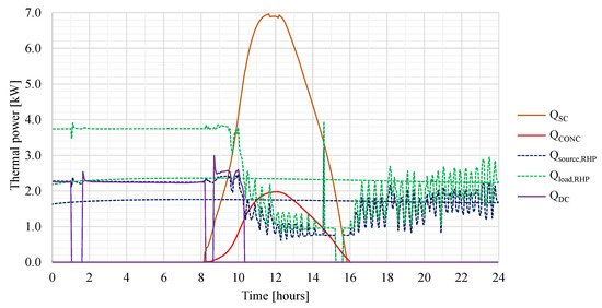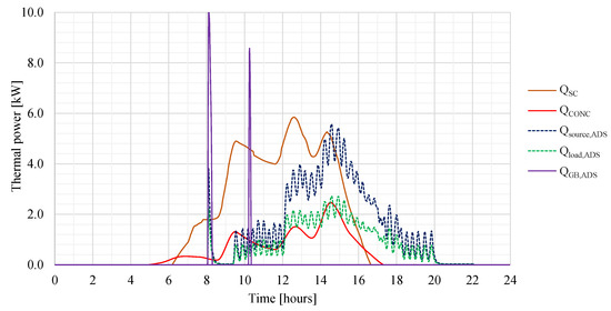 The operation of the system in terms of thermal powers of the main system components for the summer day are reported in Figure 8. In this figure, the activation and deactivation of GB and ADS are clearly pointed out. As previously mentioned, during the first morning hours GB provides auxiliary heat to ADS in order to allow its operation without turning on RHP in cooling mode. In addition, during the day the ADS cooling power, and this the thermal power supplied by TK1, increases significantly. This occurs because additional cooling must be performed for all the rooms of the building in order to keep the air temperature between 24 and 26 °C. Moreover, the dynamic trends show that the thermal energy supplied by GB to run ADS when TK1 temperature decreases below 55 °C is relatively small.