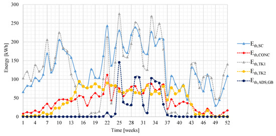 Thermal energy flows of SC, CONC, TK1, TK2, and GB for ADS, weekly analysis.