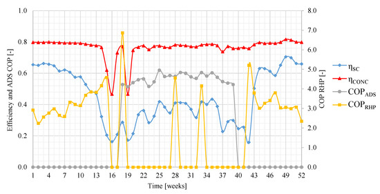 Thermal efficiency of SC and CONC and the COP of ADS and RHP, weekly analysis.