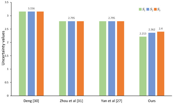 where the last term of the above equation can not be further transformed into a form similar to Shannon entropy, so that it does not measure the uncertainty of conflict. Similarly, the first term can not be further transformed into a form similar to I [40] and couldn’t measure the uncertainty of non-specificity. In other words, PPT entropy couldn’t be converted into a linear combination of and I. Here, function is used as a conflict measure and function I as a non-specificity measure. I has the following expression: