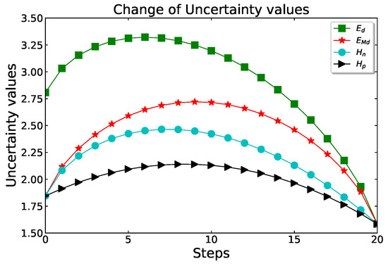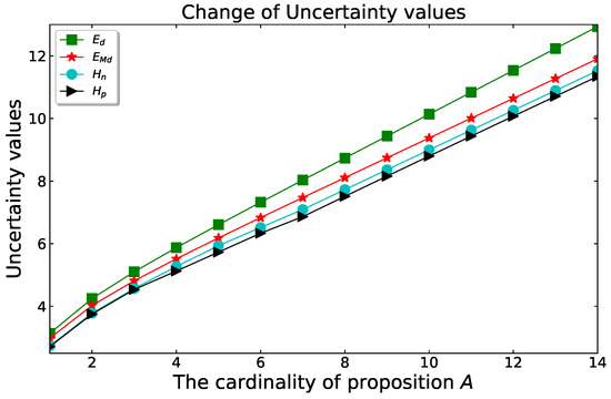 The proposition A and the FOD consist of at least one single-element subset and there is no superior limit, thus the range of and are [1,+∞). Moreover, the range of and are . Obviously, the maximum value of PPT entropy is infinite according to the Equation (12).