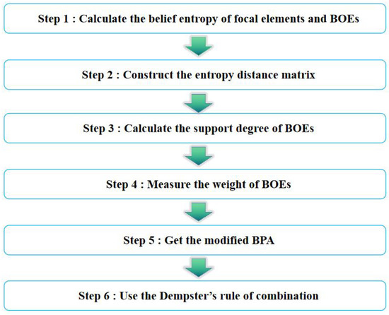 To overcome the shortcomings of the methods, we propose a novel method based on an improved entropy and entropy distance, taking into account both the impacts of self-belief entropy and mutual belief entropy on conflict management. The improved belief entropy is used to quantify the uncertainty of the evidence, so as to measure the degree of conflict from a global perspective. PPT entropy introduces pignistic probability transformation function into Yan et al.’s entropy [27]. Compared with the state-of-the-art belief entropy [27,30,31,32,33,34], it can measure the uncertainty of evidence more accurately, and make full use of the intersection information of evidence to better estimate the degree of evidence conflict. Given the good performance of PPT entropy, this paper chooses it to measure the uncertainty of body of evidence (BOE). Entropy distance describes the entropy difference between evidence, so as to measure the degree of conflict from a local perspective. These two measures are mutually complementary in a sense.