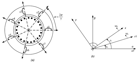 The schematic representation of stator and rotor phase windings of the seven-phase squirrel-cage induction motor (a) and the coordinate systems used in the analysis (b).
