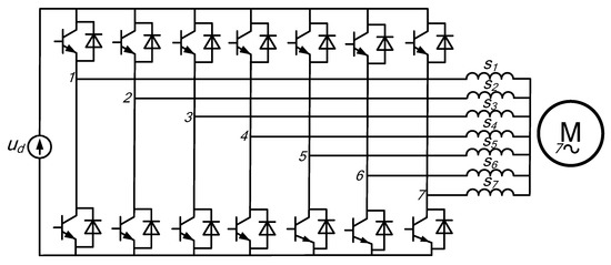 In the analysis considered in this article, it was assumed that the seven-phase induction motor was powered by a seven-phase two-level voltage source inverter (VSI). The scheme of the two-level seven-phase VSI is presented in Figure 2 [10,11].