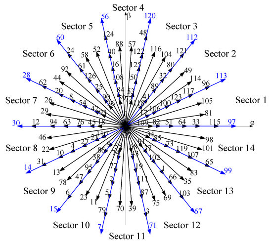 Figure 3 shows the set of all voltage vectors generated by the seven-phase VSI for various combinations of inverter conduction states in α–β stationary coordinate systems [9,15,16,17,18,19].