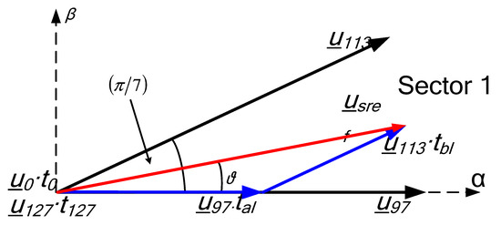 In the analyzed DTC-SVM method, it was assumed that the space vector modulation method for the seven-phase VSI is based on the synthesis of the set value of the stator voltage vector with the use of two long voltage vectors and two zero voltage vectors generated by the seven-phase VSI during the modulation pulse period. The rule of determining the reference voltage vector with the selecting of two active and two zero voltage vectors is presented in Figure 4 [9,16,17,18].